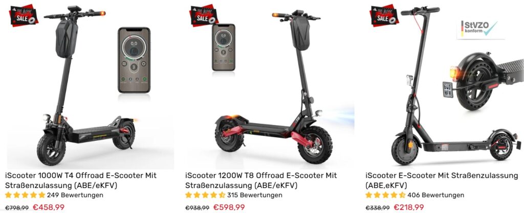 | iScooter E9 Max | 498,99 Euro | -200,- € auf 298,99 € | 8% Rabattcode: ‚eroller8%‘ | 223,92 € = ca. -45% Rabatt | 275,07 € |