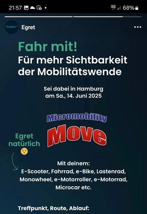 Micromobility Move 2025 in Hamburg – Der Event für Freunde der Elektrokleinstfahrzeuge, E Scooter: Uhrzeit, Beginn, Ablauf, Uhrzeiten. Micromobility Move Hamburg ist eine Veranstaltung, die sich auf urbane Mobilitätslösungen konzentriert und verschiedene Mikromobilitätsoptionen wie E-Scooter, Fahrräder und Mikrocars präsentiert. Das nächste Event findet am Samstag 14. Juni 2025 statt.